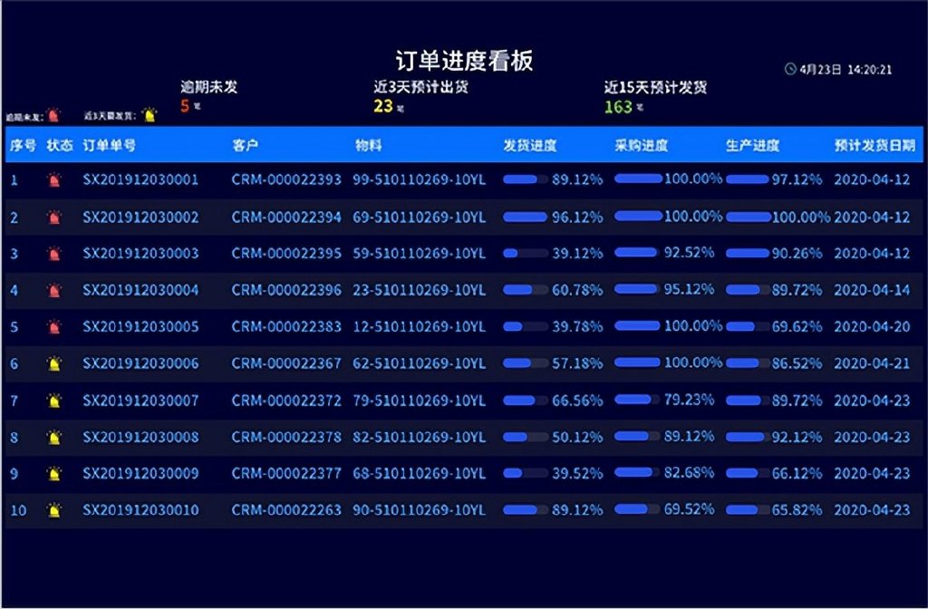 机械制造业ERP系统提供车间现场看板管理,管理人员可以通过车间看板,获取所需制品生产进度及车间生产实时信息,对生产现场进行监督与控制;通过系统快速定位问题点,发现问题并及时采取措施,提升生产异常处理能力,有效提高生产效率,保障订单准时交付。